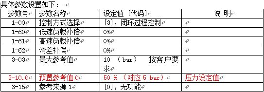 通過以上設置,當恒壓系統中泵的轉速低于20.1 Hz時,延時10秒,啟動休眠模式,變頻器停止輸出;在泵處在休眠狀態時,當恒壓供水系統的壓力反饋值低于4 bar時,延時10秒,啟動變頻器,這樣就實現了恒壓供水系統的休眠功能。