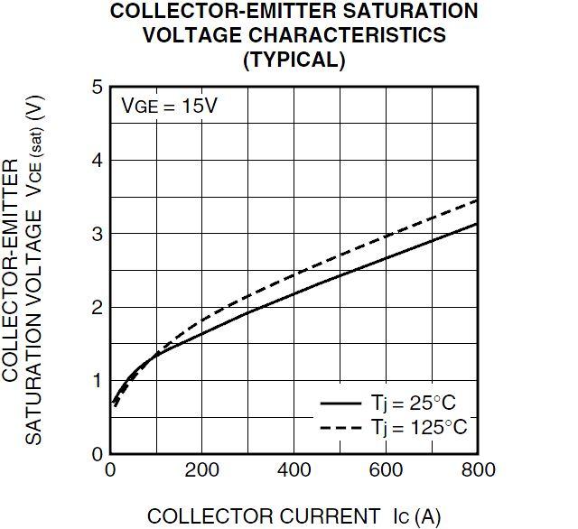 查到三菱CM400DY-34A和英飛凌FZ400R17KE3的晶體管特性與其完全相同,因此可以使用他們的“VCE-IC”特性曲線,獲得制動晶體管的導(dǎo)通壓降。