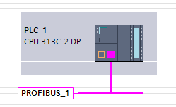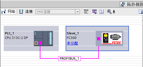 將變頻器 FC300 拖動到 PROFIBUS_1 連接線處后,PLC 和變頻器連接在一起,FC300 顯 示為未分配。