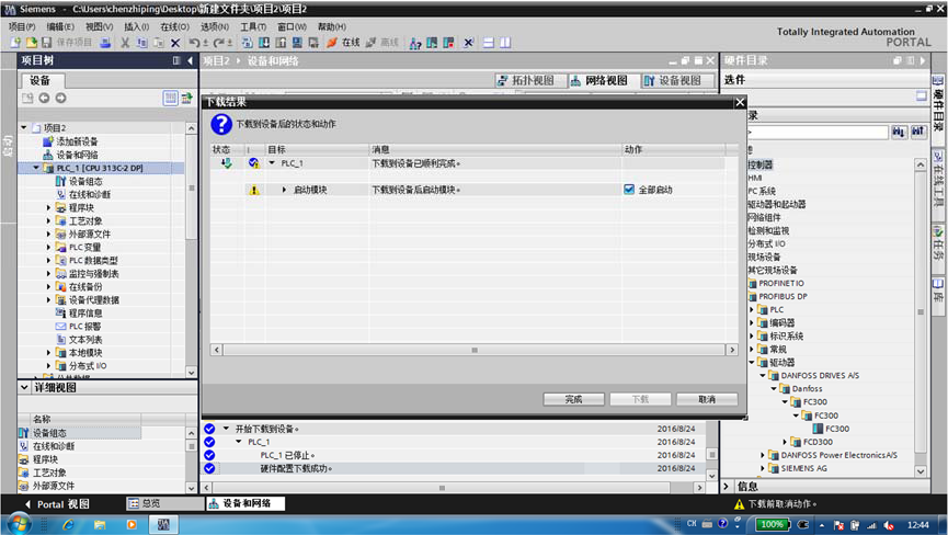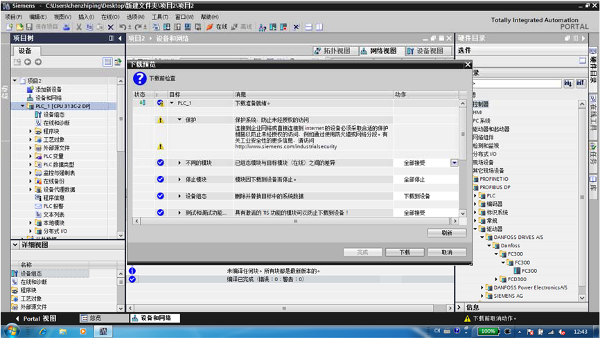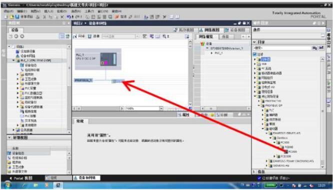 七、:配置丹佛斯變頻器(進入‘網絡視圖’-打開右側‘硬件目錄’-選擇‘其他現場 設備’-‘PROFIBUS DP’-‘驅動器’-‘DANFOSS DRIVESA/S’-‘DANFOSS’-‘FC300’-‘FC300’-‘FC300’),將其如圖七所示拖動。