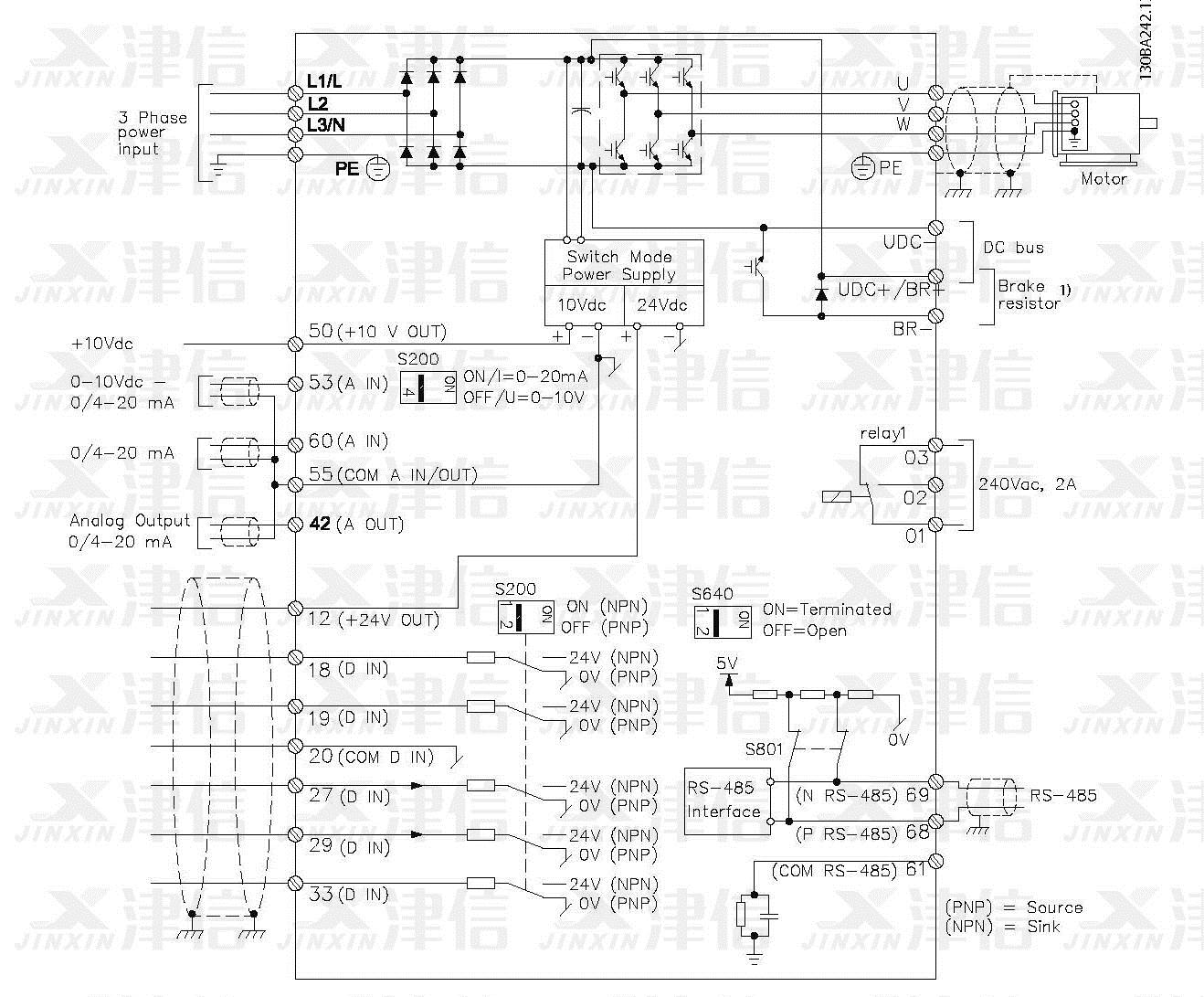 1) J1–J5 上配有內(nèi)置制動斬波器。