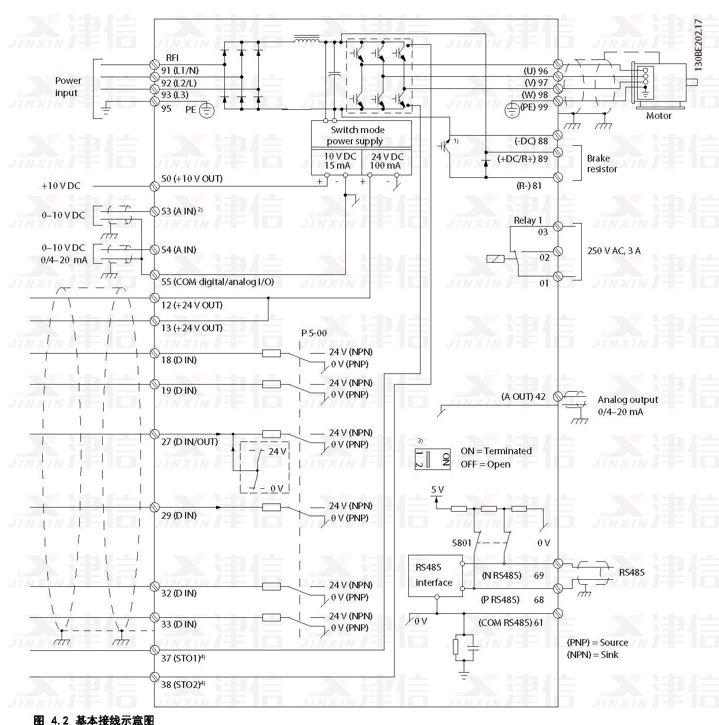 4) 開關 S801(總線端子)可用于端接 RS485 端口(端子 68 和 69)。