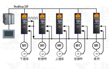 驅(qū)動系統(tǒng)的整體結構如圖四,每根軸獨立按自己的電子凸輪曲線運行,屬于典型的分布式控制系統(tǒng),對主控制器的性能要求,一般的PLC就能勝任。由于每根軸都與主軸保持電子凸輪同步關系,所以總體上可以實現(xiàn)多軸同步的控制需求。其中下跑車運動控制器比較特殊,他具有虛擬主軸脈沖輸出的功能,代替主控制器發(fā)送主軸脈沖信號。