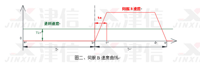 當下跑車從左往右運動時,伺服B保持靜止,伺服A的平均速度要等于Vi,伺服C的速度要等于Vi/2。當下跑車從右往左運行時,伺服A的平均速度依然等于Vi,但是方向相反,伺服B的速度為伺服A的2倍,伺服C的速度為伺服A的速度加上Vi/2。下面以伺服B為例,分析如何用電子凸輪控制功能控制伺服B的運行。圖二為鋪網(wǎng)機工作時伺服B的運行速度特征曲線。圖中Vi為原料輸入速度,T為鋪網(wǎng)頭從一端走到另一端花費的時間,t