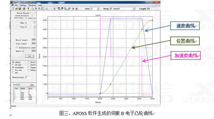 丹佛斯MCO305的開發(fā)軟件為APOSS,內(nèi)置電子凸輪曲線生產(chǎn)功能,加上述計算得到的a、b、c、d、e 五點電子凸輪曲線特征點按軟件要求填入表格,就能自動生成如圖三所示的電子凸輪曲線。