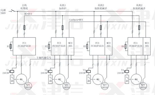 丹佛斯FC300高性能驅(qū)動(dòng)器加上新一代MCO305高速運(yùn)動(dòng)專(zhuān)用控制器,可實(shí)現(xiàn)定位控制功能。電機(jī)可以選用異步或同步伺服電機(jī)。支持各種各樣的電機(jī)反饋裝置,從增量編碼器、絕對(duì)位置編碼器一直到旋轉(zhuǎn)變壓器。針對(duì)丹佛斯MCO305同步控制功能,上海津信變頻器有限公司為客戶(hù)在食品飲料行業(yè)吹瓶機(jī)上進(jìn)行了技術(shù)應(yīng)用。
